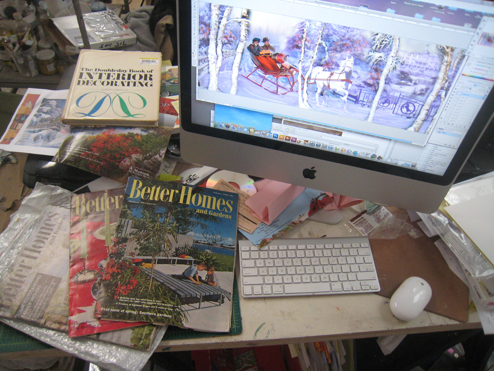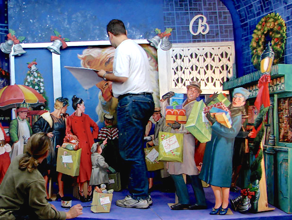 One by one, each piece finished was assembled into the appropriate full-sized set in the studio. When the sets had their final touches, each set was then disassembled, packed, and brought back to Bloomingdales and installed into the windows.