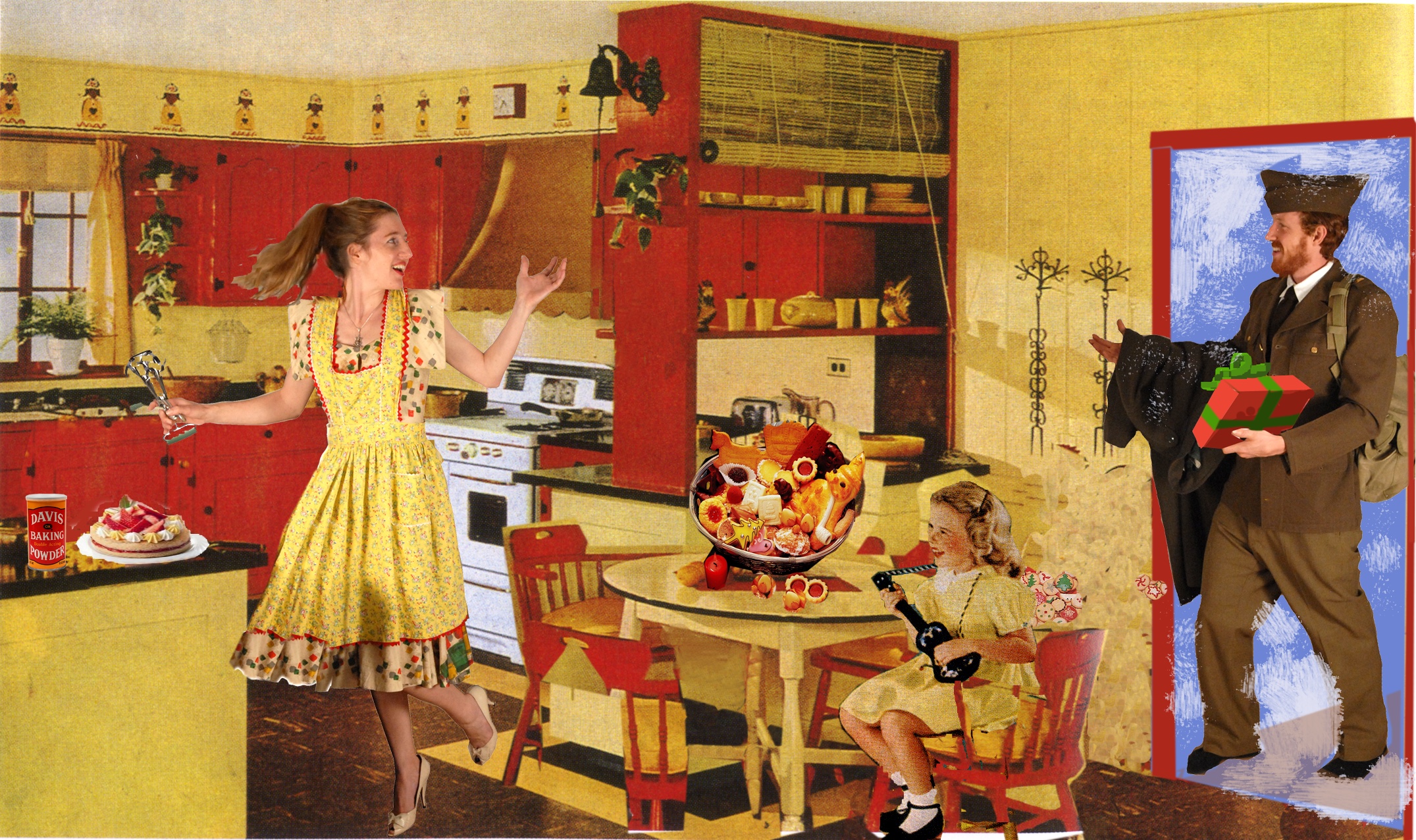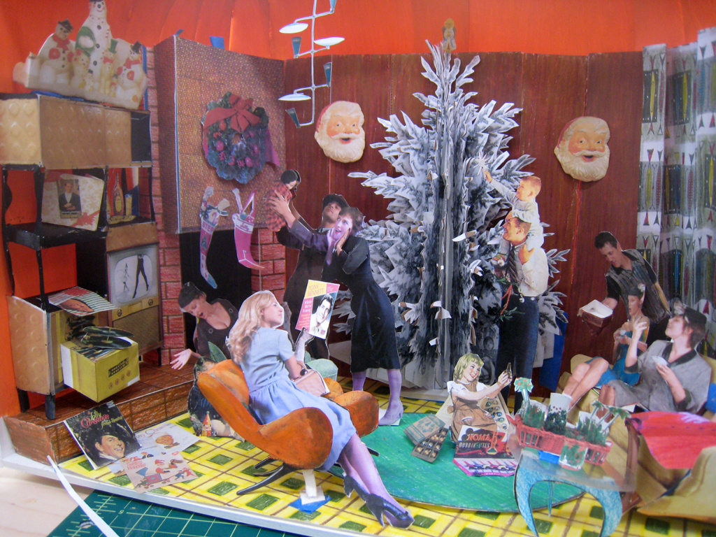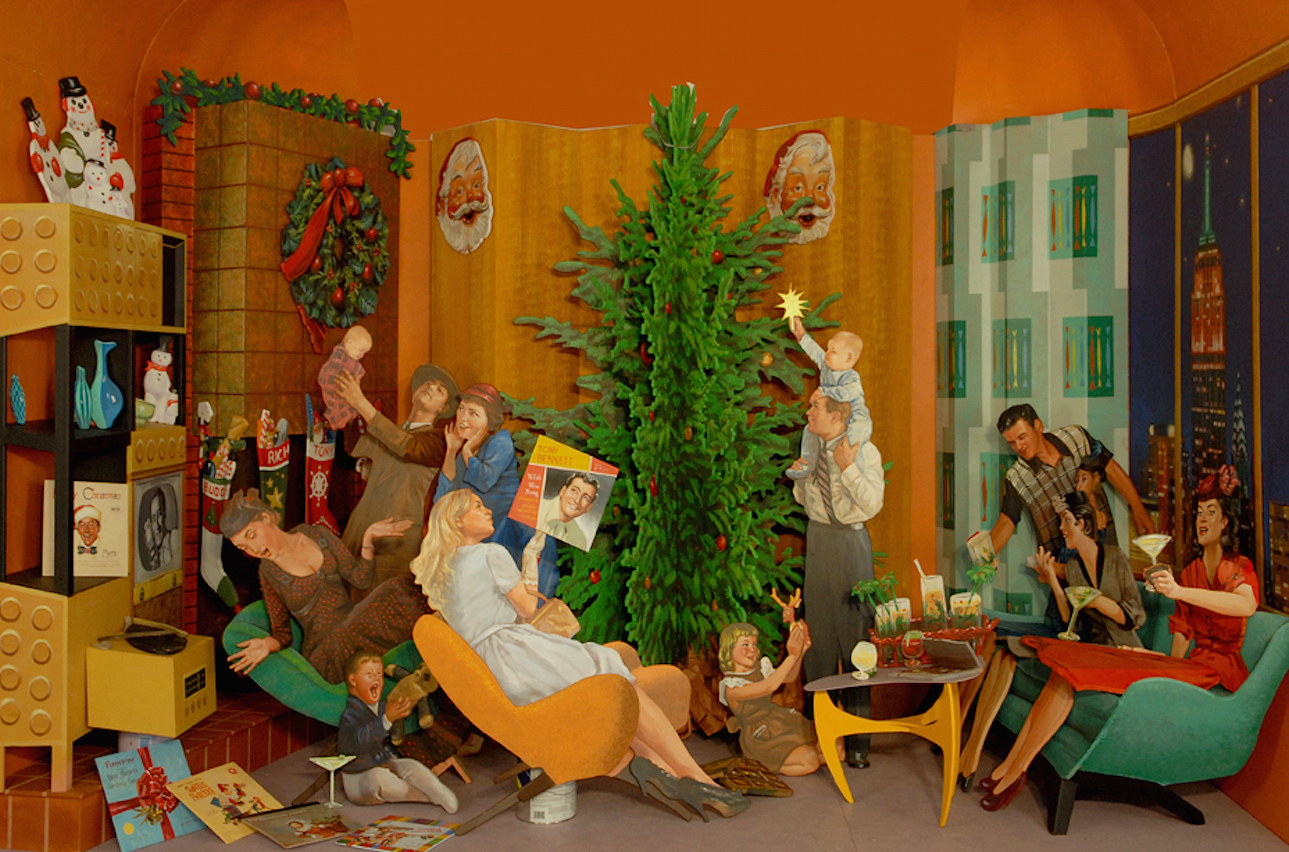 The first task was to photograph the models in vintage clothing that suited the theme of each window. The next task involved researching appropriate items that one would have in a vintage living room, a kitchen, a children’s room, etc. Vicki soon realized she simply wanted to create the same kind of Christmas she had as a little girl growing up before society turned a cynical eye on the traditional holiday. She wanted a day defined purely by candy canes, cookies, cocktails, and huge, over-the-top decorated Christmas trees with piles of presents below, just as she remembered.