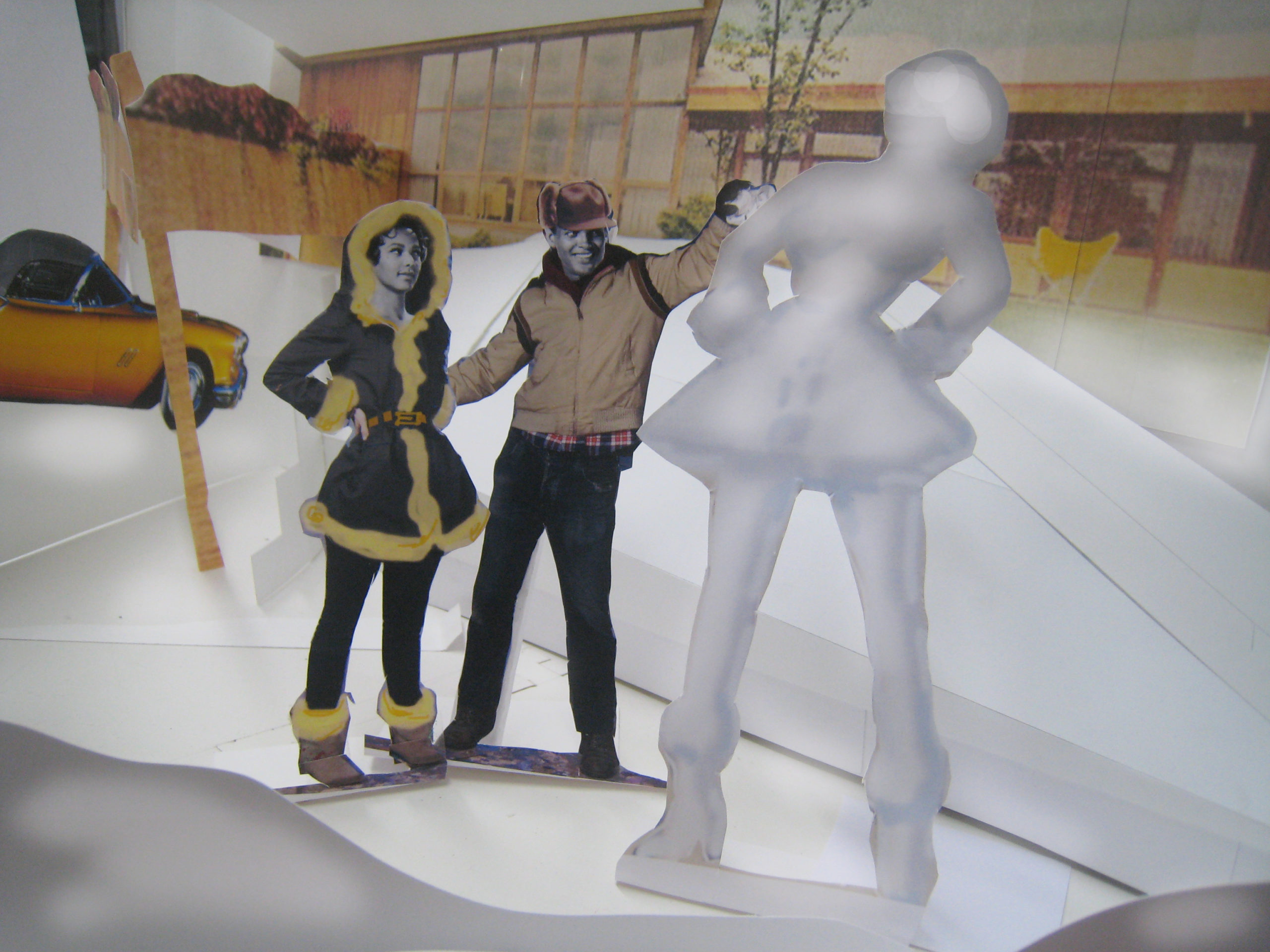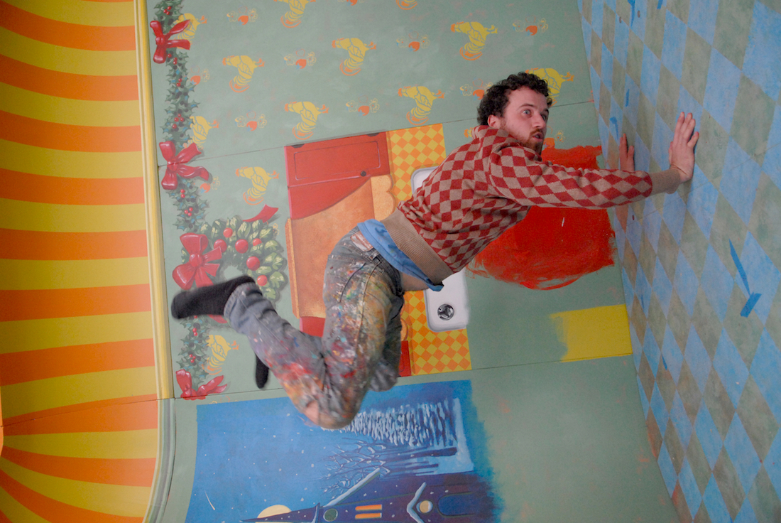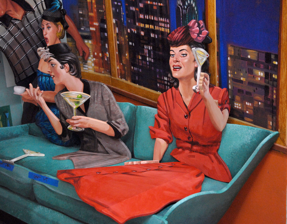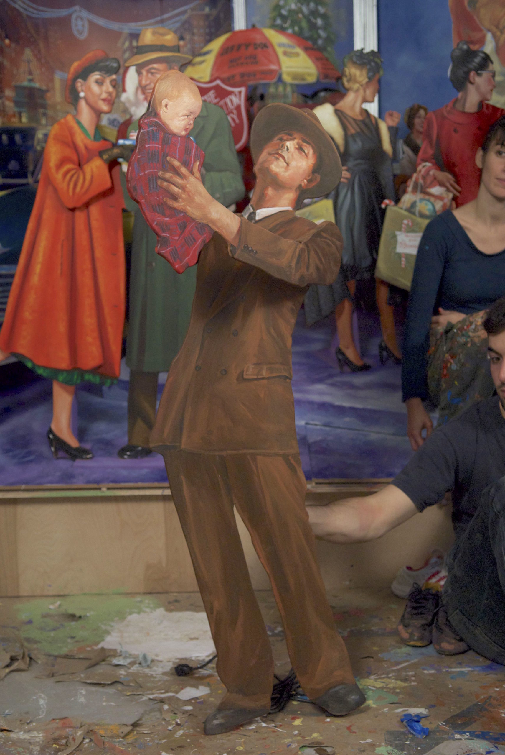 Finally, the artists set about painting, in an illustrative style of the 50’s, each of over 500 pieces that made up the separate sets full of objects, furniture, backdrop murals, and dozens of portraits.