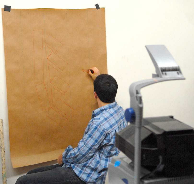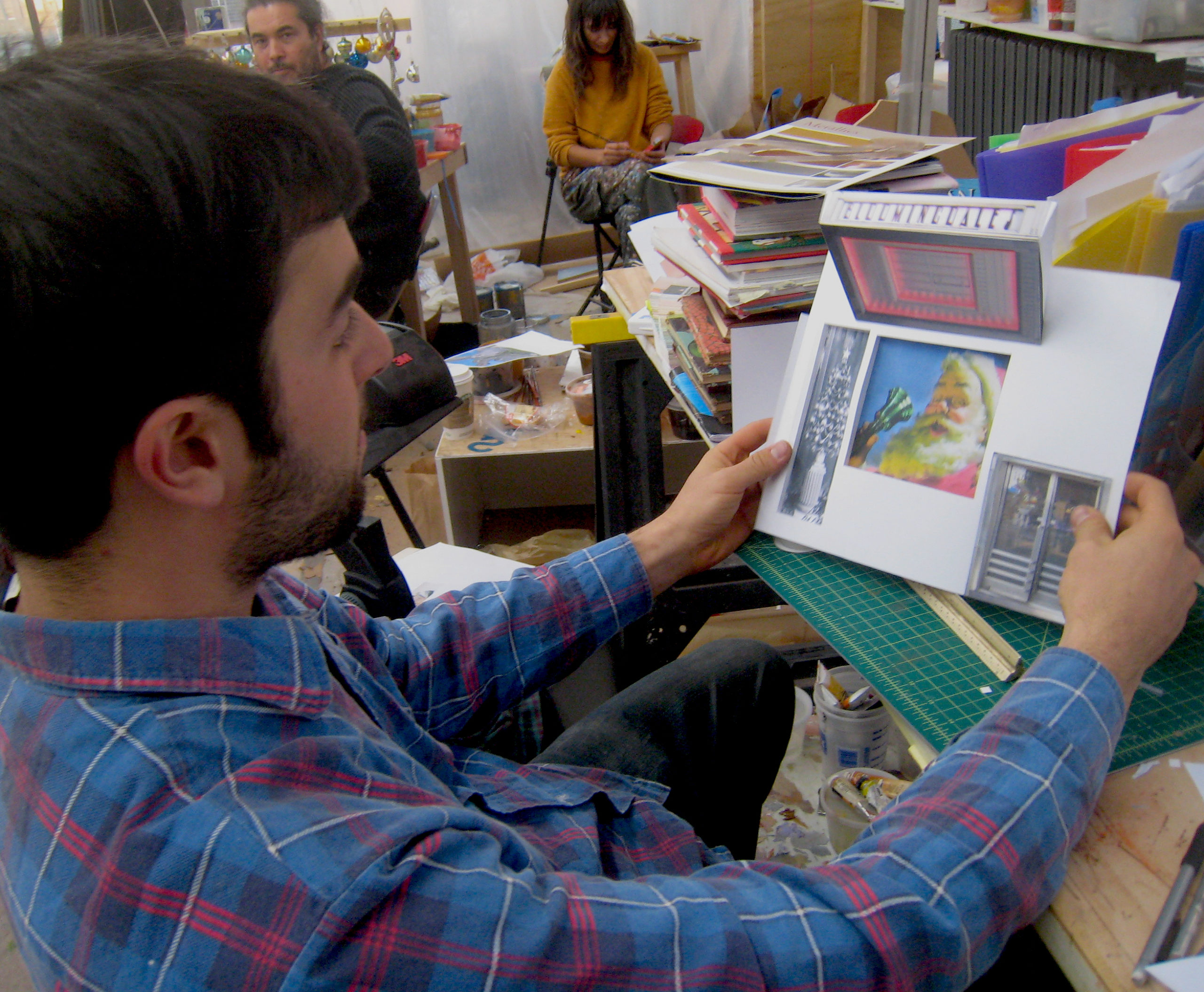 After the sets were composed, each paper item was then taken from the model set one at a time and projected to the original 3/4 foot scale, and outlined on paper. Each one of the paper templates was then labeled and delivered to the Bloomingdale’s wood shop where skilled carpenters carefully cut out each piece on the MDF board and then shipped it back to Khuzami Studio.