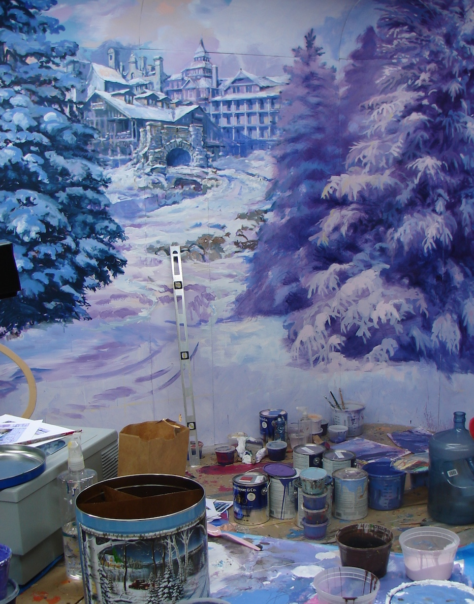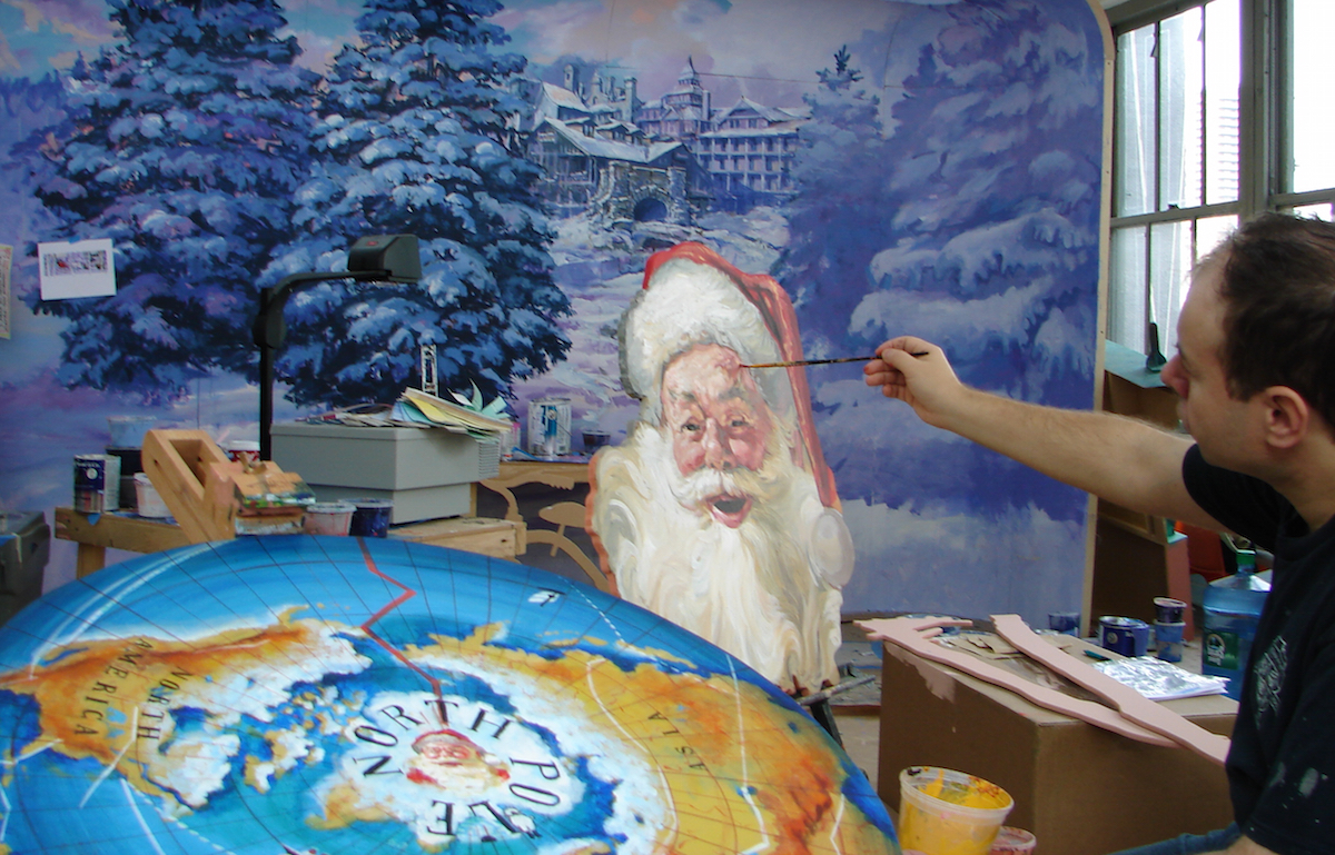 The materials for production were only 4’ x 8’ MDF boards and gallons of Benjamin Moore house paints. Harry Medina had created a set of concept sketches that provided the ideas for each window, based on the Christmas songs from Tony Bennett’s Christmas album, which Mr. Bennett would be performing on opening