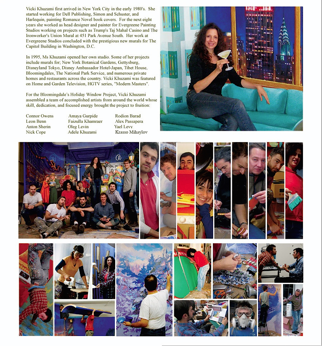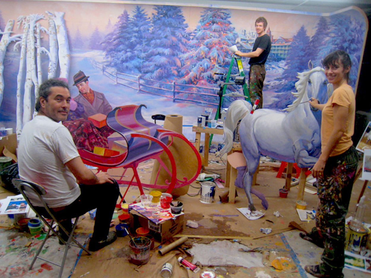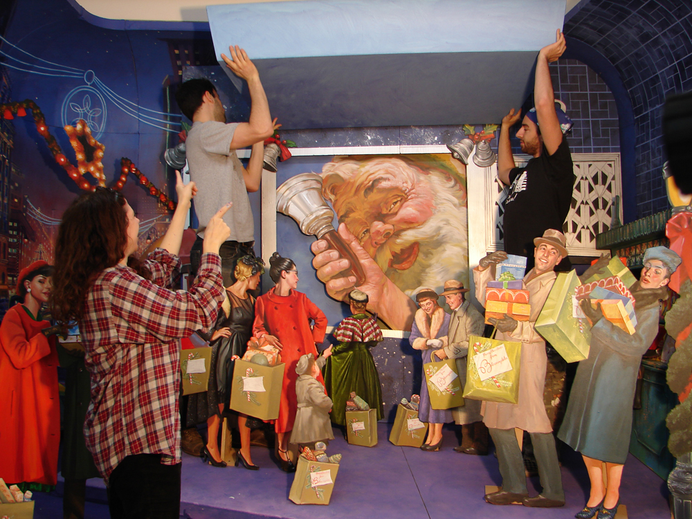 In 2008, Head of Bloomingdale’s Window Display Director, Harry Medina, asked Khuzami Studio to produce their famous Holiday Windows. Vicki Khuzami immediately scouted the city to assemble a super team of 14 talented artists. The schedule was tight, and every inch of the window sets was to be hand-painted…no mannequins, costumes, or props would be used.